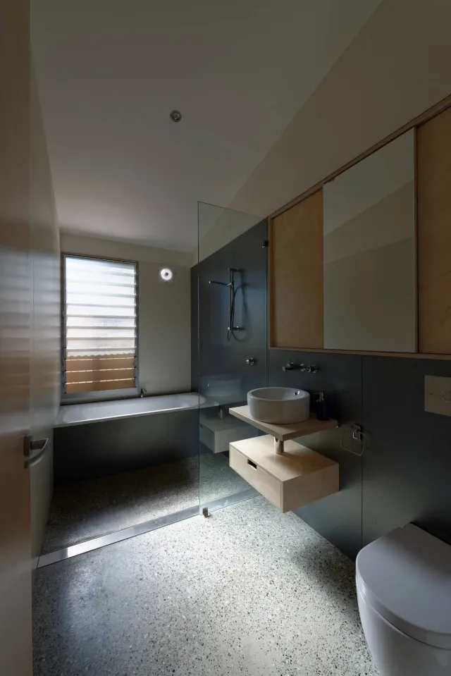 Wet areas (bath/shower) should be sited as far from the entry door as possible. Only a single sink is required.