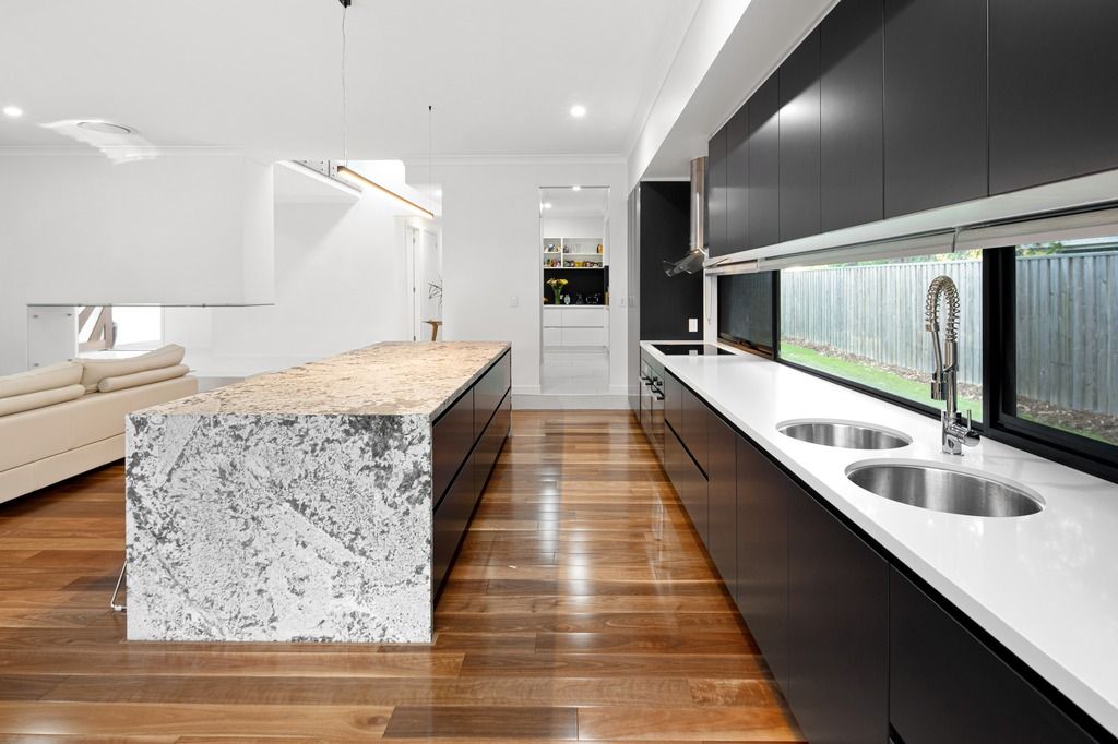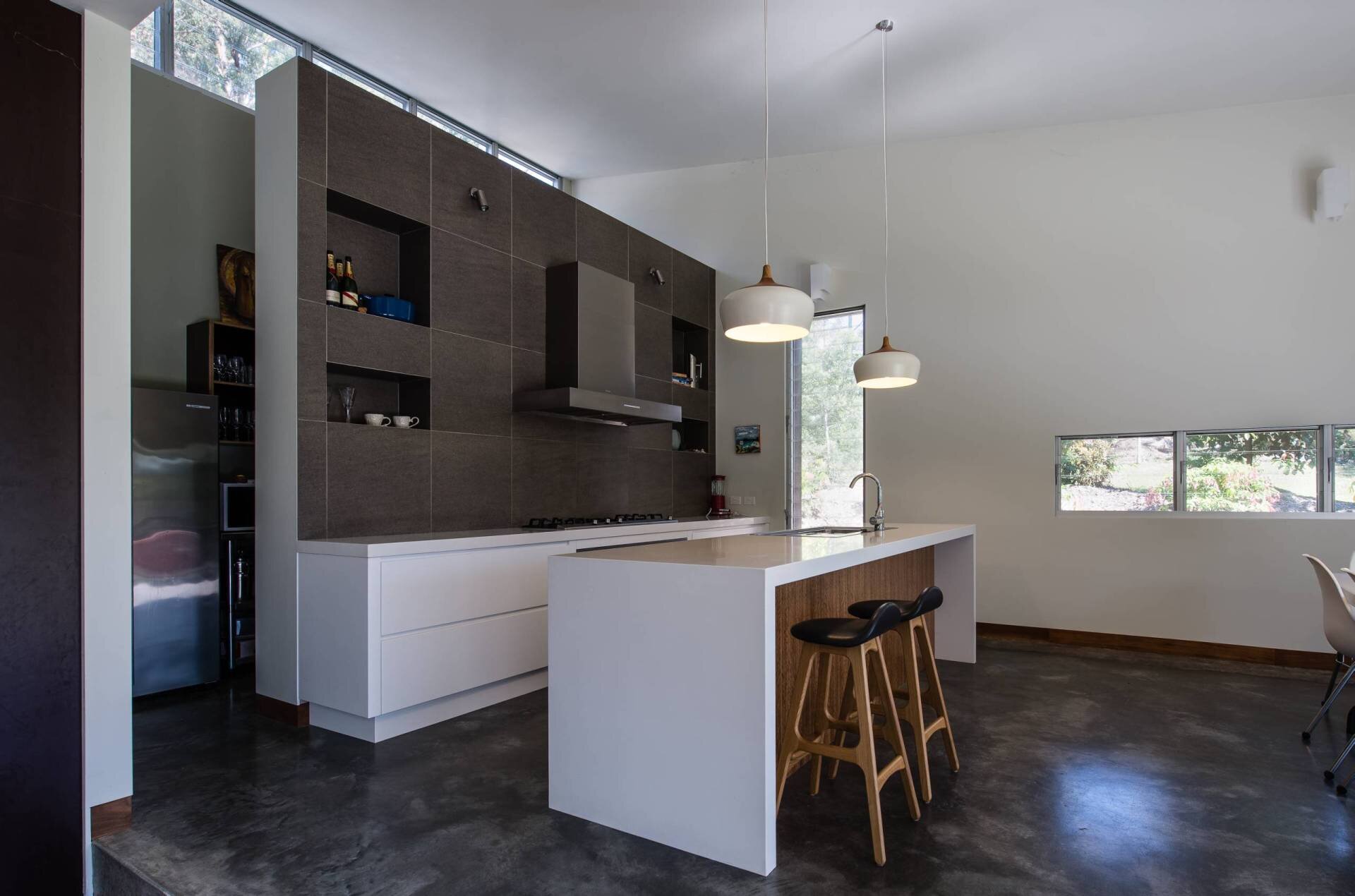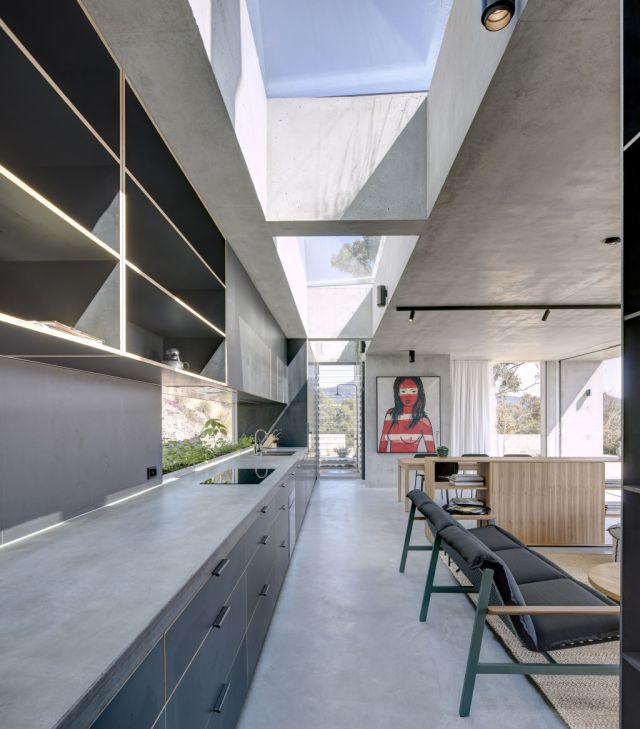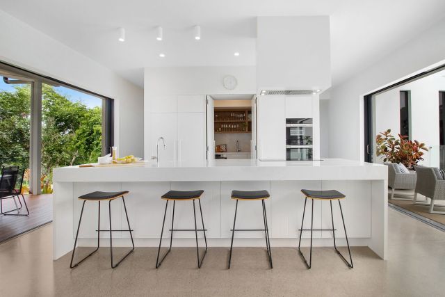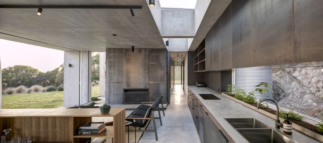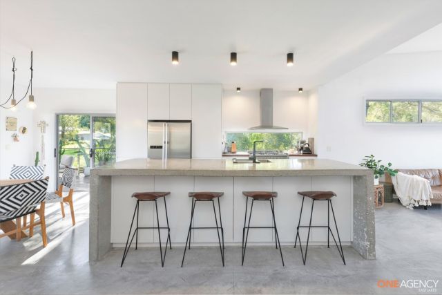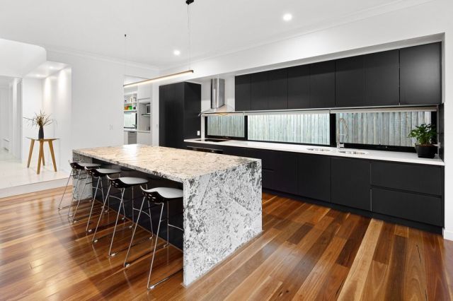 - Thick concrete or stone benchtops