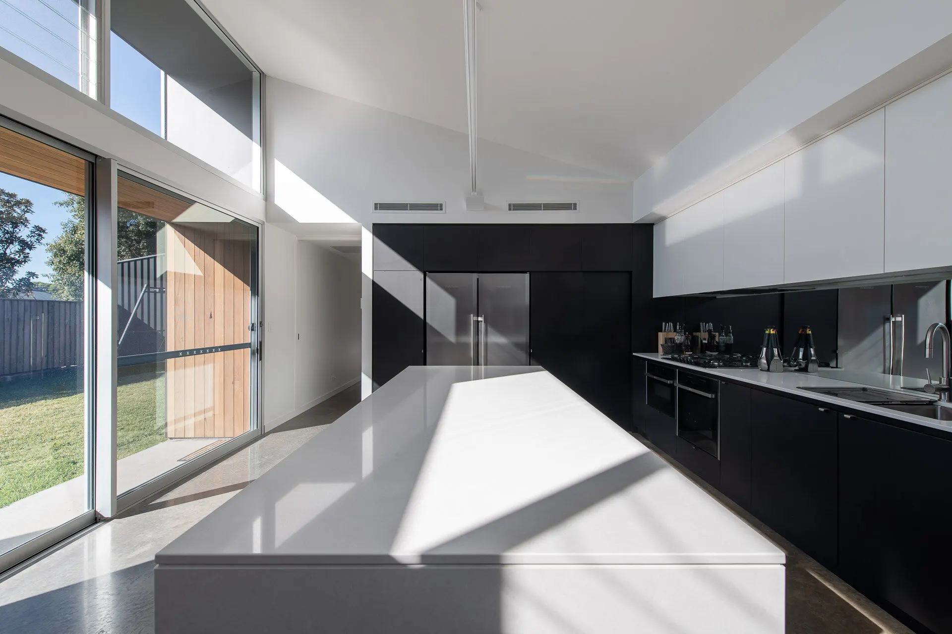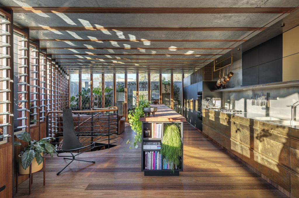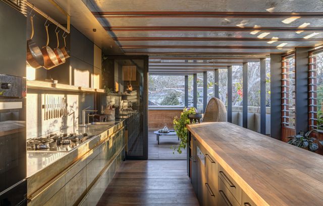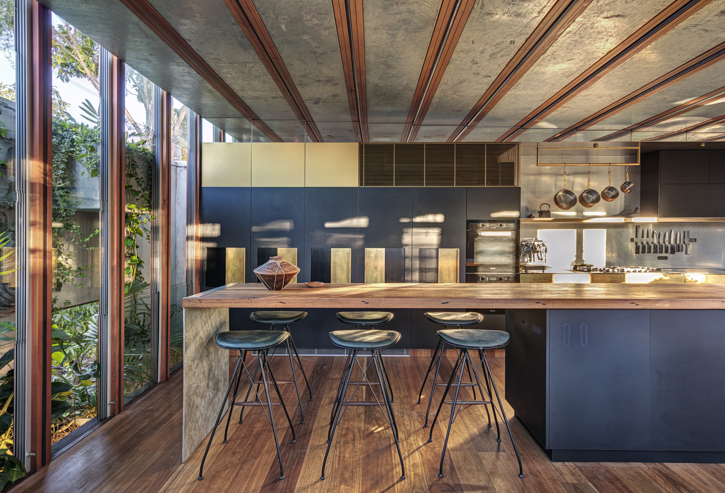 - Thick concrete or stone benchtops