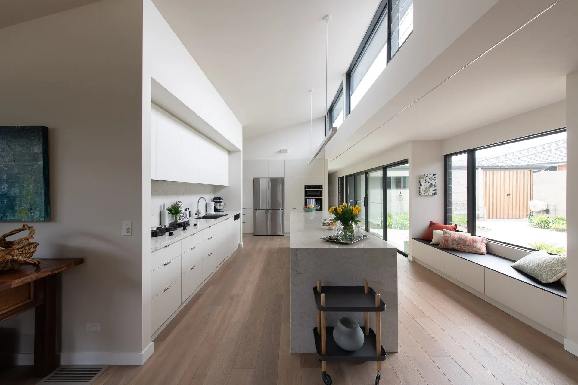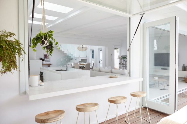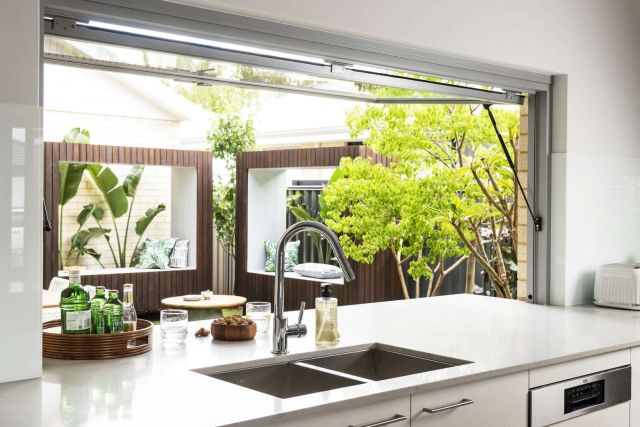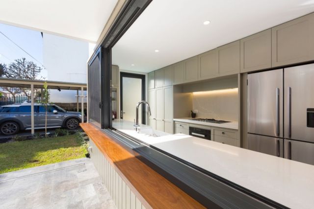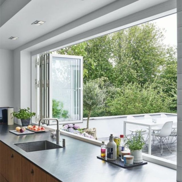 We cook and eat a lot outside throughout the year and would like the kitchen to be “linked” to the garden and flow into the outdoor space, either via fold-away doors opening up directly onto the outdoor kitchen and/or by way of a large servery window with a counter.